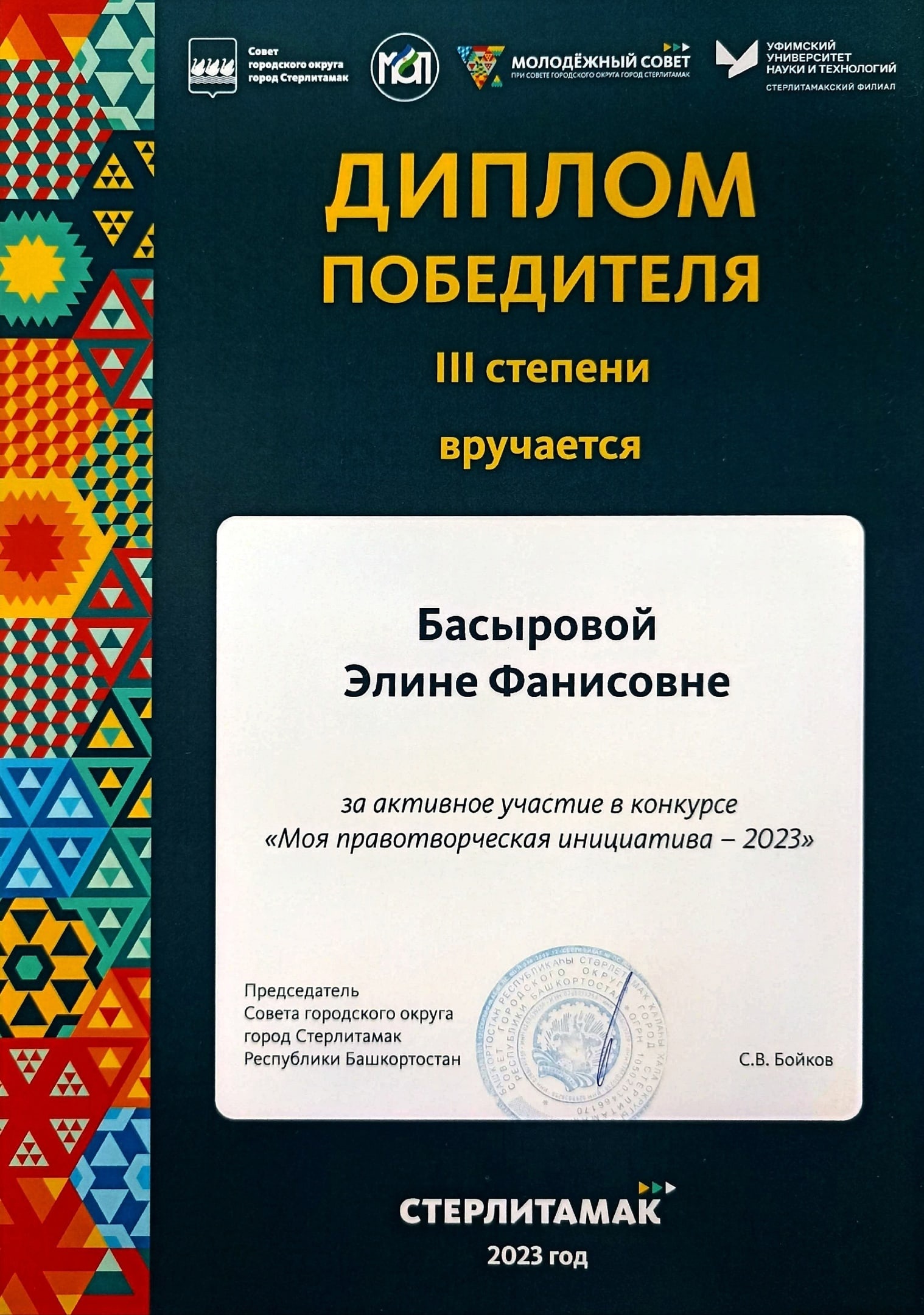 По итогам конкурса Басырова Элина Фанисовна награждена дипломом III степени и памятными подарками.