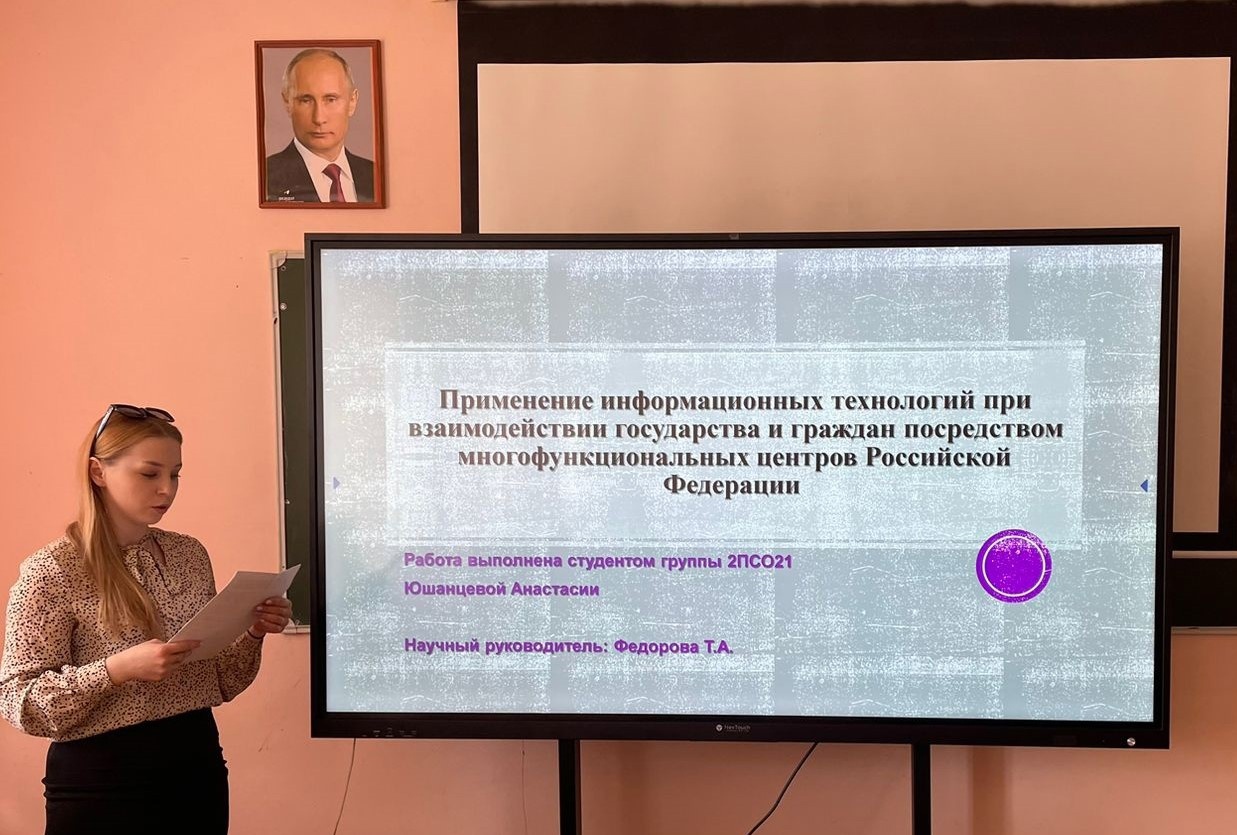С докладами выступили студенты 1 и 2 курсов специальности 40.02.01 Право и организация социального обеспечения. Всего выступило 5 студентов по наиболее актуальным вопросам в сфере информационных технологий в деятельности суда, информационных угроз и информационной безопасности, применение информационных технологий при взаимодействии государства и граждан.