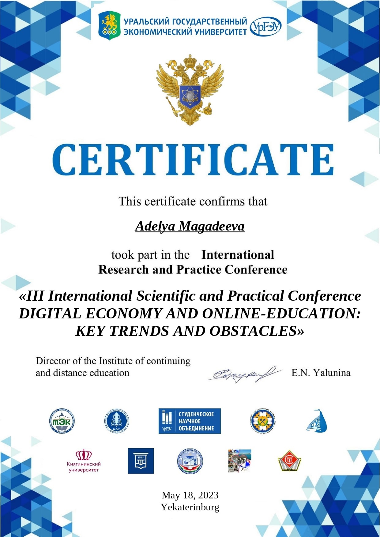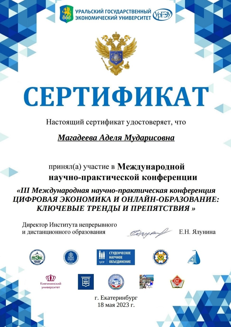 18 мая 2023 года преподаватель экономических дисциплин колледжа СФ УУНиТ Магадеева А.М. приняла участие в III Международной научно-практической конференции «Цифровая экономика и онлайн-образование: ключевые тренды и препятствия».