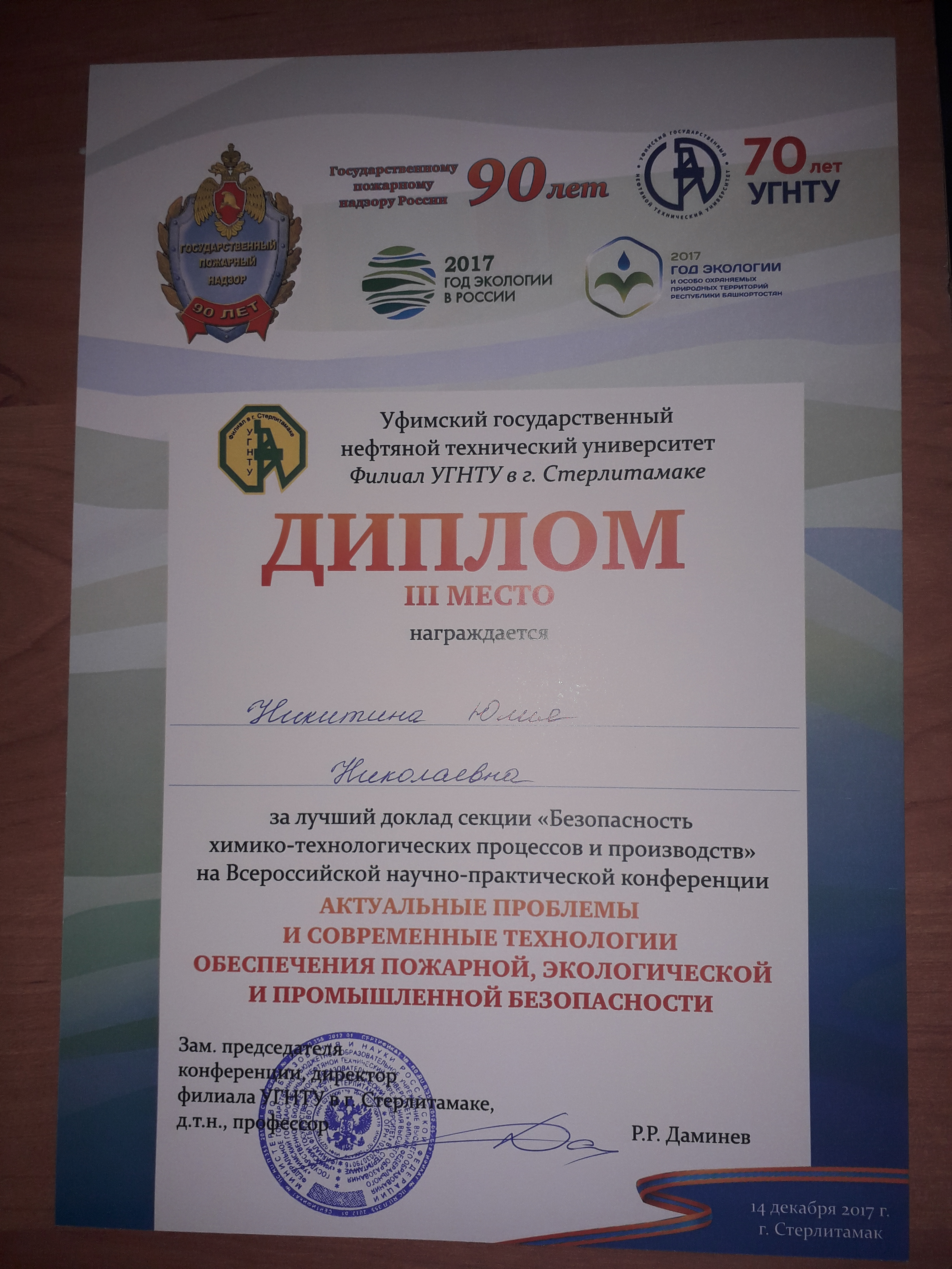 – «За лучший доклад» секции «Безопасность химико-технологических процессов и производств»