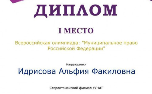 Идрисова Альфия заняла заслуженные первые призовые места во Всероссийских Олимпиадах по муниципальному праву и была награждена дипломами. Научный руководитель, старший преподаватель кафедры конституционного и муниципального права юридического факультета Стерлитамакского филиала УУНиТ,