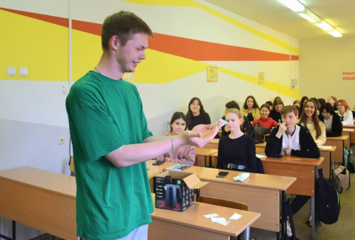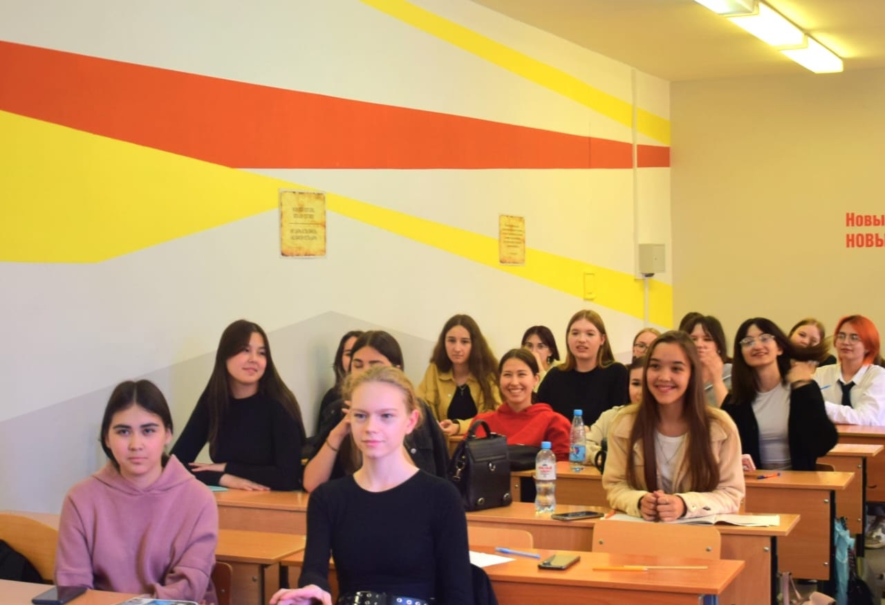 Преподаватели русского и английского языков Семенова Арина Игоревна и Матвеева Ксения Алексеевна вместе со студентами первого курса угадывали английские слова, которые студенты находили в волшебной шляпе и объяснили их жестами!