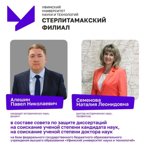 По приказу Министерства науки и высшего образования Российской Федерации от 27 июня 2023 г. № 1353/нк в состав совета по защите диссертаций на соискание ученой степени кандидата наук, на соискание ученой степени доктора наук 24.2.479.12 на базе федерального государственного бюджетного образовательного учреждения высшего образования «Уфимский университет науки и технологий» со Стерлитамакского филиала вошли: Алешин Павел Николаевич - заместитель директора по научной работе, кандидат исторических наук, доцент (ученый секретарь) и Семенова Наталия Леонидовна - доктор исторических наук, профессор (член совета).