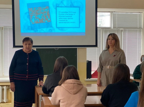 Ибяева Амелия рассказала биографию писателя. Выступление сопровождалось видеопрезентацией, которую подготовила Соболь Анна. Далее прозвучали стихи поэта «Заметался пожар голубой» (Тамурова Илиза), «Письмо к женщине» (Лиана Шайгарданова).