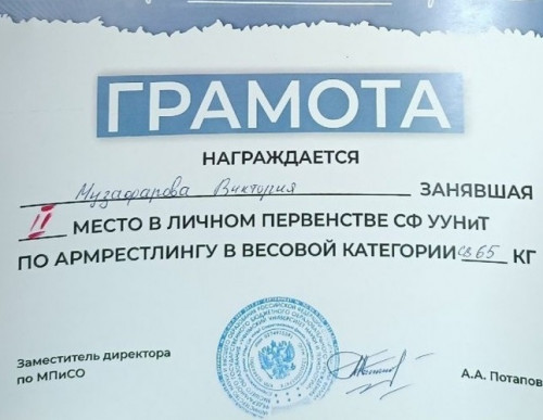 Студентка группы НДО11 Музафарова Виктория заняла 2 место в весовой категории до 65 кг.