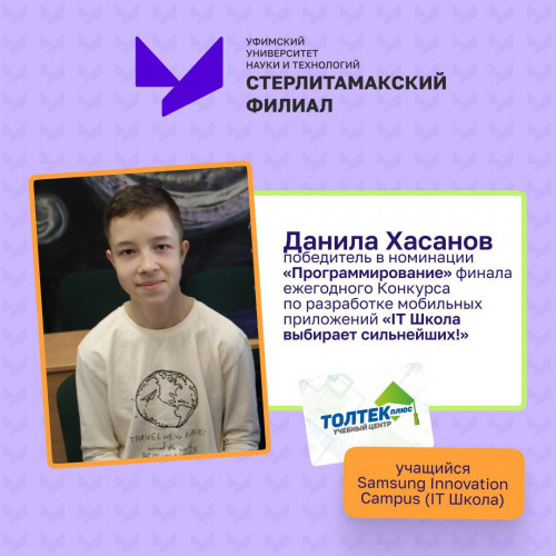 Данила Хасанов — победитель в номинации «Программирование» финала ежегодного конкурса по разработке мобильных приложений «IT Школа выбирает сильнейших!»