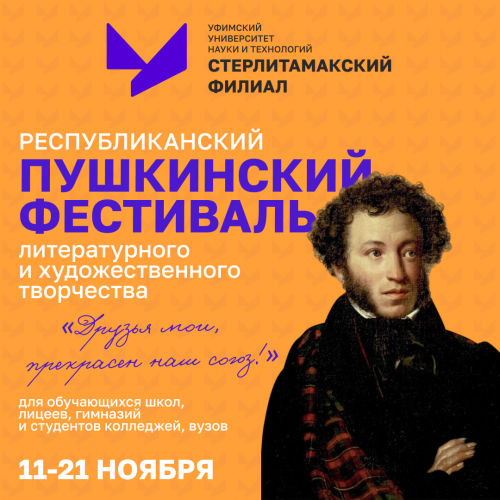 Филологический факультет, кафедра русского языка и литературы Стерлитамакского филиала УУНиТ с 11 по 21 ноября 2024 года проводят ежегодный Республиканский Пушкинский фестиваль литературного и художественного творчества обучающихся школ, лицеев, гимназий и студентов колледжей, вузов «Друзья мои, прекрасен наш союз!», посвящённый юбилеям А.С. Пушкина, М.Ю. Лермонтова и Году семьи в Российской Федерации.