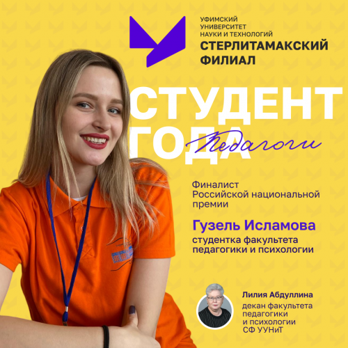 Приветствуем второго финалиста Российской национальной премии «Студент года.Педагоги» – Гузель Исламову, студентку четвёртого курса факультета педагогики и психологии СФ УУНиТ.