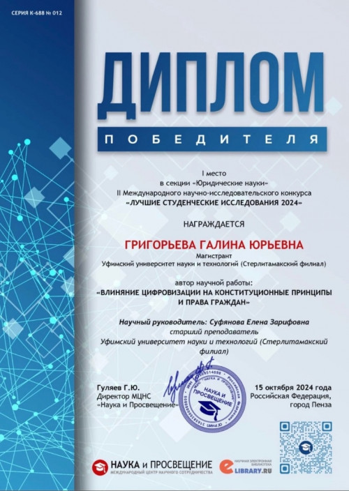 В числе представленных исследований на конкурс была направлена работа магистранта 1 курса юридического факультета СФ УУНиТ Григорьевой Г.Ю., подготовленная под научным руководством старшего преподавателя кафедры публичного и частного права Суфяновой Е.З. под названием «Влияние цифровизации на конституционные принципы и права граждан».
