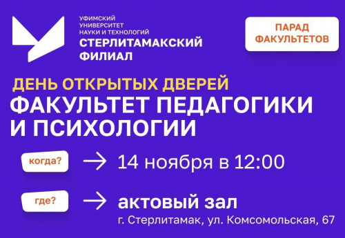 14 ноября 2024 года факультет педагогики и психологии СФ УУНиТ вновь откроет свои двери для будущих абитуриентов!