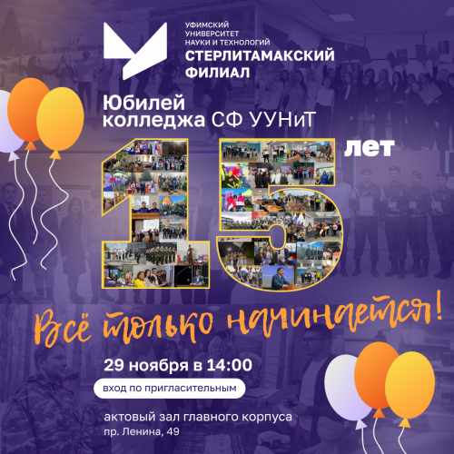 Друзья, приглашаем вас на торжественное мероприятие, посвященное юбилею колледжа Стерлитамакского филиала УУНиТ!