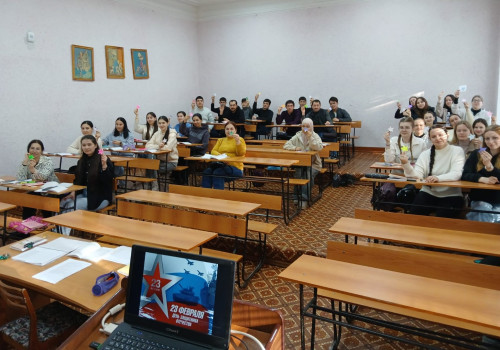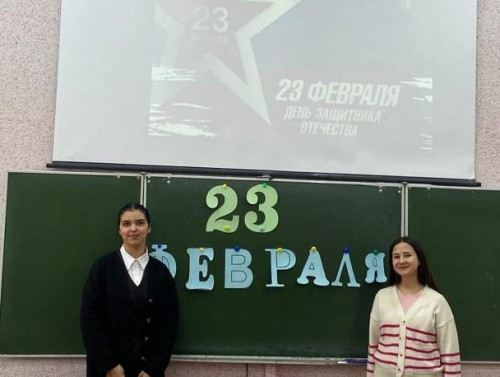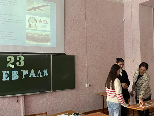 Валиуллина Гульназ и Мансурова Тюркан рассказали историю возникновения праздника, познакомили с видами войск Российских Вооруженных сил и военными профессиями. Также провели викторину, вопросы которой были связаны с военной историей, с именами Героев Отечества, студенты прочли стихотворения.