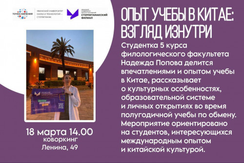 Надеждой Поповой, студенткой 5 курса филологического факультета СФ УУНиТ, которая поделится своим опытом полугодичной учёбы по обмену в Китае!