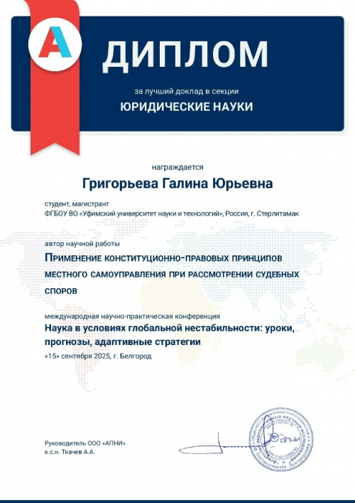 Среди участников конференции была и студентка второго курса магистратуры юридического факультета СФ УУНиТ Григорьева Г.Ю., которая представила свой научно-практический доклад на тему "Применение конституционно-правовых принципов местного самоуправления при рассмотрении судебных споров". Научным руководителем выступила старший преподаватель кафедры публичного и частного права Суфянова Е.З.