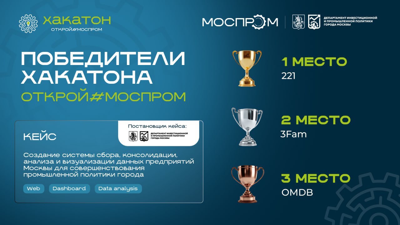 Команда "3Fam" успешно справилась с кейсом Департамента инвестиционной и промышленной политики города Москвы, разработав систему сбора, консолидации, анализа и визуализации данных предприятий столицы.