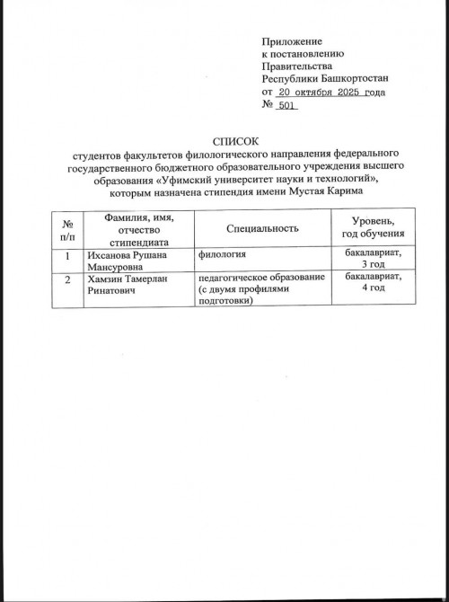 Премьер-министр Правительства республики Андрей Назаров утвердил соответствующие распоряжения, направленные на поощрение талантливой молодежи. Эти меры призваны мотивировать студентов к дальнейшему углубленному изучению башкирского языка и литературы, а также к активному участию в научной и творческой жизни региона.