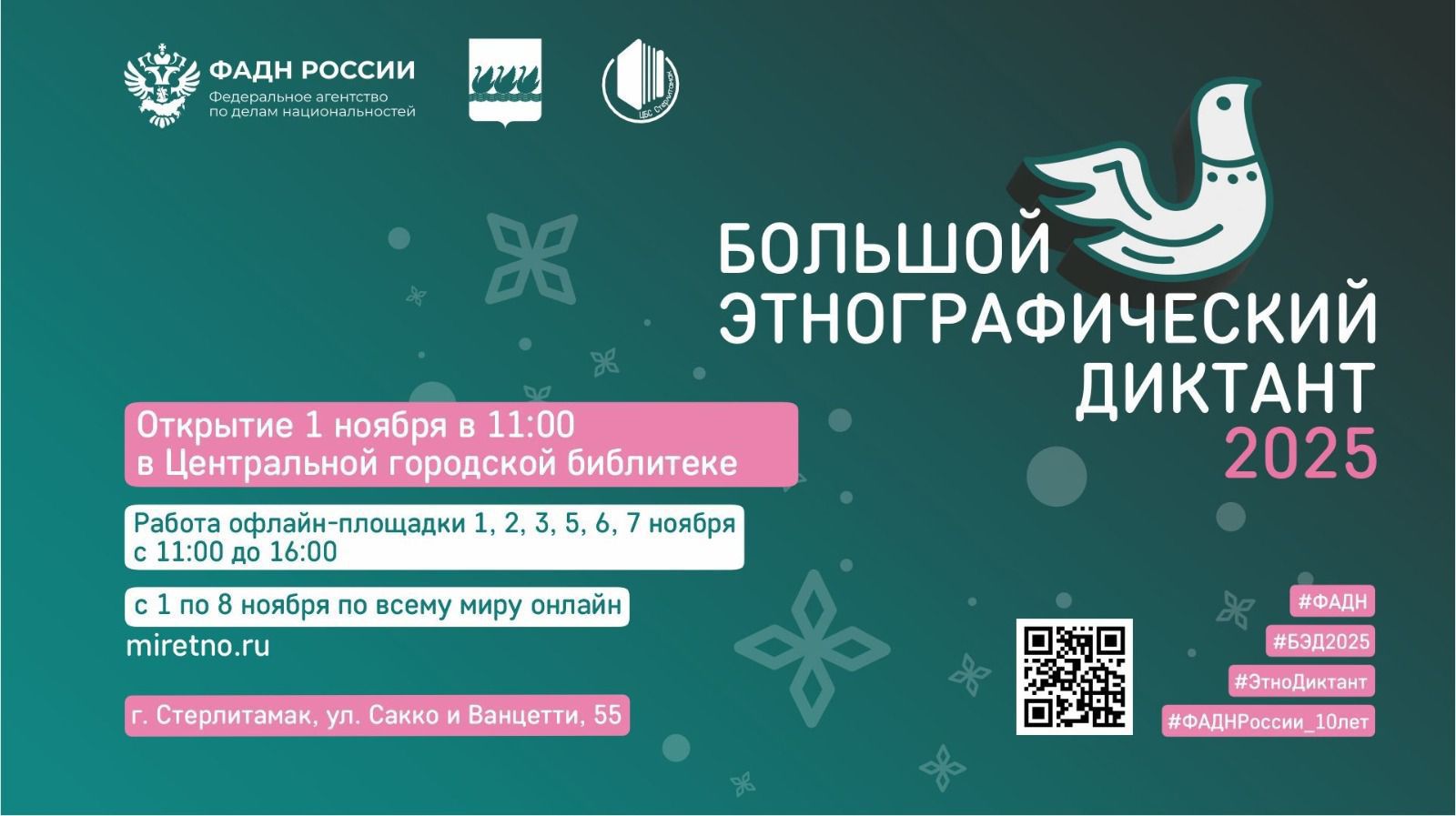 Мероприятие проводится в двух удобных форматах: можно на официальном портале Акции национальнаяполитика.рф в период с 1 по 8 ноября 2025 года и на специальной муниципальной площадке на базе Центральной городской библиотеки по адресу: г. Стерлитамак, ул. Сакко и Ванцетти, 55.