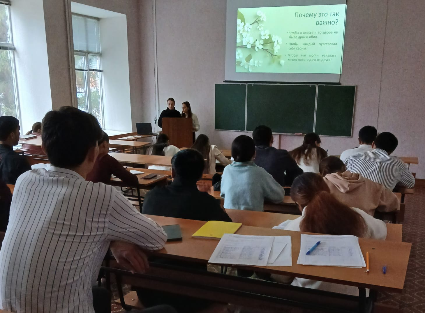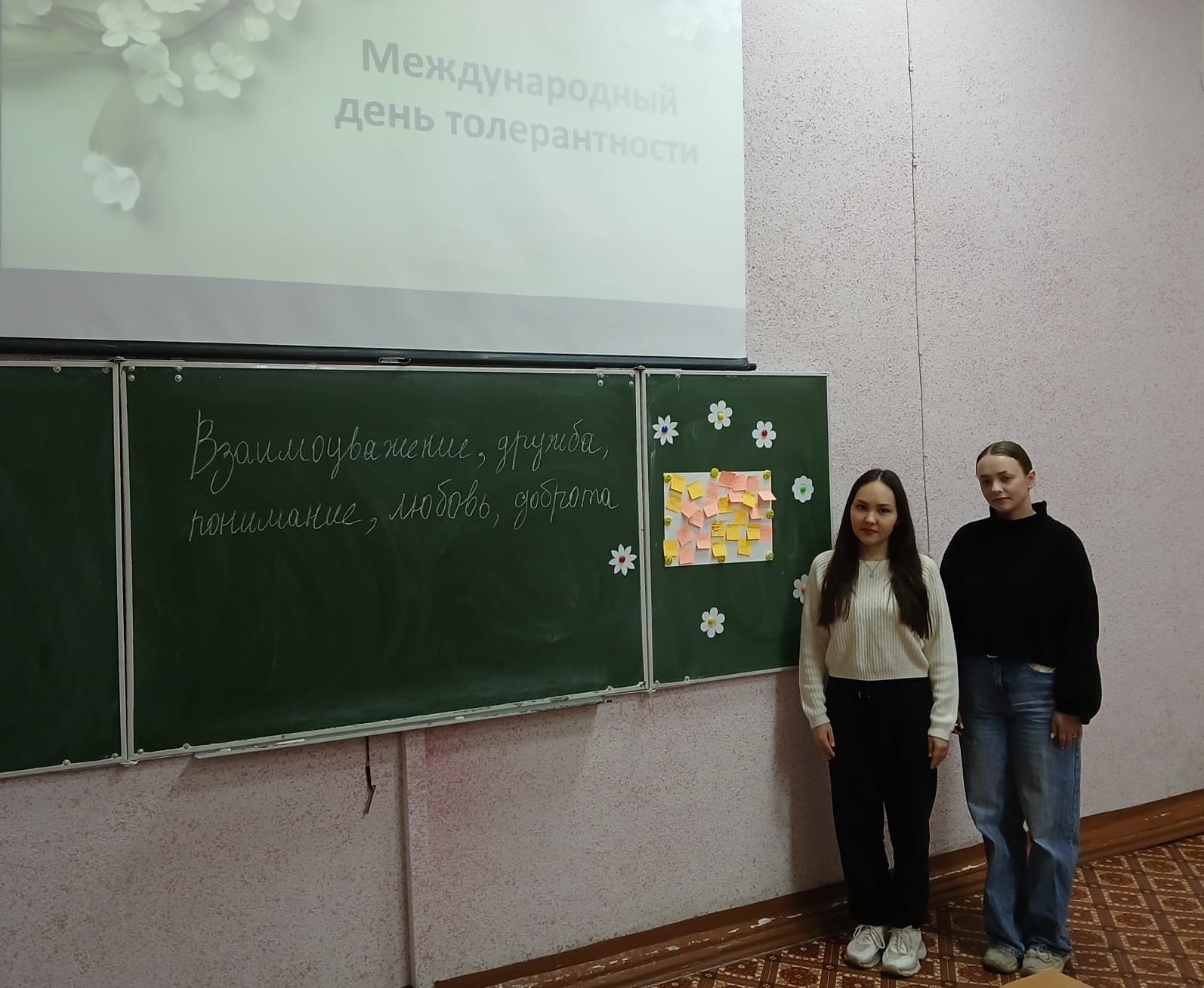 Об истории праздника рассказали студенты гр. НДО21 Давлетшина Кристина и Рахимкулова Алина. Познакомили с понятием «толерантность», «терпимость», «уважение» и «принятие», с чертами присущими толерантному человеку, поговорили о милосердии, доброте, сочувствии, сопереживании, уважении к культуре, традициям и мнениям других людей. Студенты обсудили, почему важно быть толерантным в повседневной жизни, как это помогает строить дружеские отношения и создавать гармоничное общество. С большим интересом оформили дерево толерантности.
