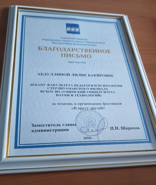 Декану факультета педагогики и психологии Л.Б. Абдуллиной вручено благодарственное письмо от заместителя администрации города Стерлитамака П.Н. Шорохова за помощь в организации фестиваля.