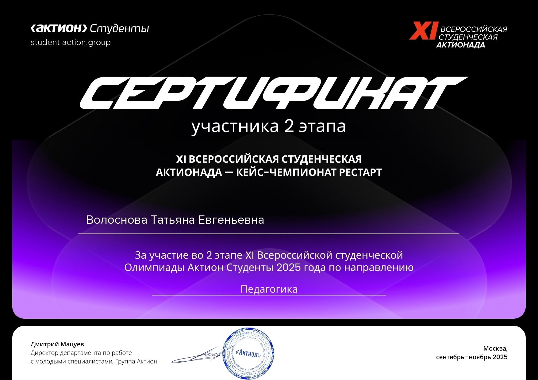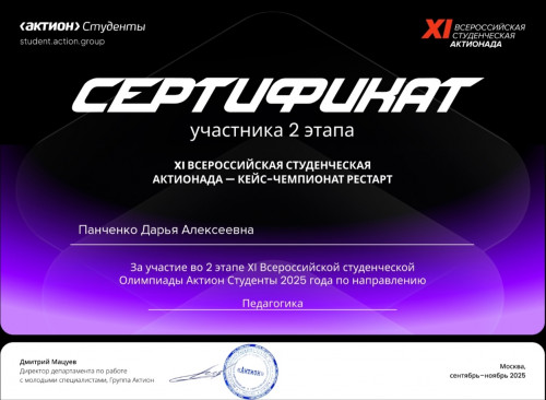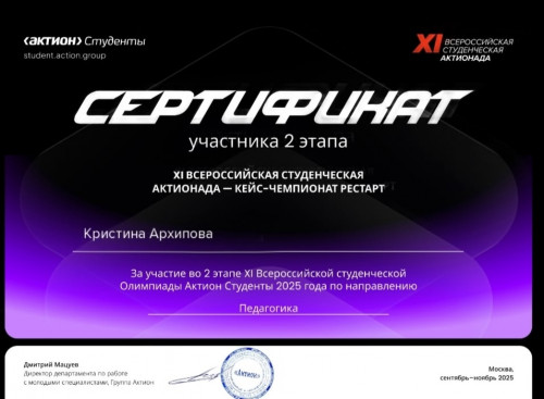 Второй этап Актионды проходит с 15 сентября 2025 г. по 28 декабря 2025г. Участникам предстояло решить кейс-задание по направлению "Педагогика", где нужно было создать презентацию для педагогического совета с новыми идеями профориентационной работы с младшими школьниками.