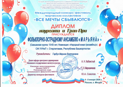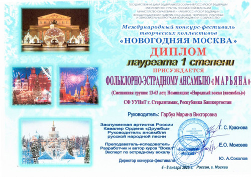 Результаты двух конкурсов подтвердили высочайший уровень подготовки наших артистов: Народный фольклорно-эстрадный ансамбль «Марьяна» стал обладателем диплома ГРАН-ПРИ и Лауреата I степени.