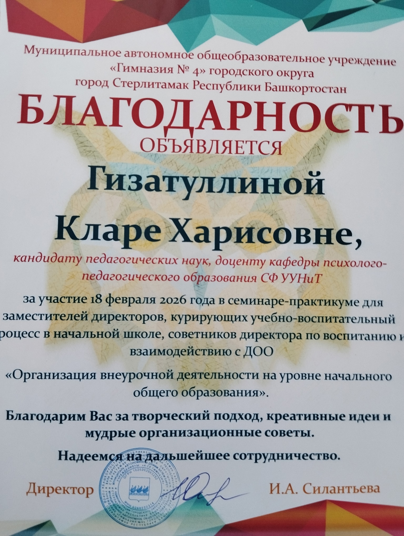 В теоретической части семинара принимала участие кандидат педагогических наук, доцент, доцент кафедры психолого-педагогического образования факультета педагогики и психологии Гизатуллина К.Х. Она выступила с докладом «Организация внеурочной деятельности на уровне начального общего образования». Ответила на вопросы участников. В конце мероприятия Гизатуллиной К.Х. была объявлена Благодарность «За творческий подход, креативные идеи и мудрые организационные советы».