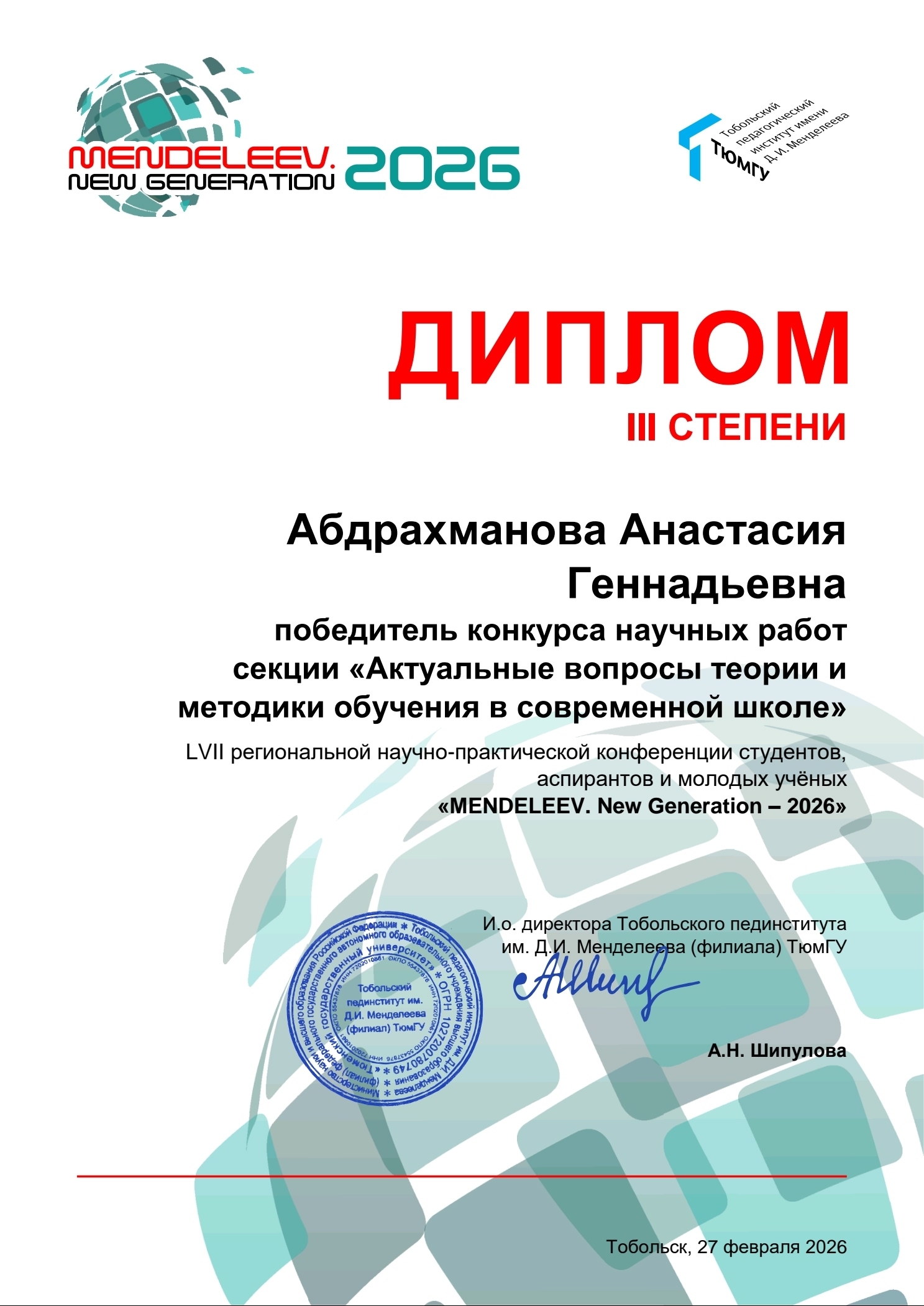 LVII Региональная научно-практическая конференция «MENDELEEV. New Generation» прошла 27 февраля 2026 года в стенах Тобольского педагогического института имени Д.И. Менделеева (филиала ТюмГУ). Ежегодное мероприятие собрало около 90 участников, представляющих города Тюменской области – Тобольск, Ишим, Тюмень, а также город Стерлитамак Республики Башкортостан.
