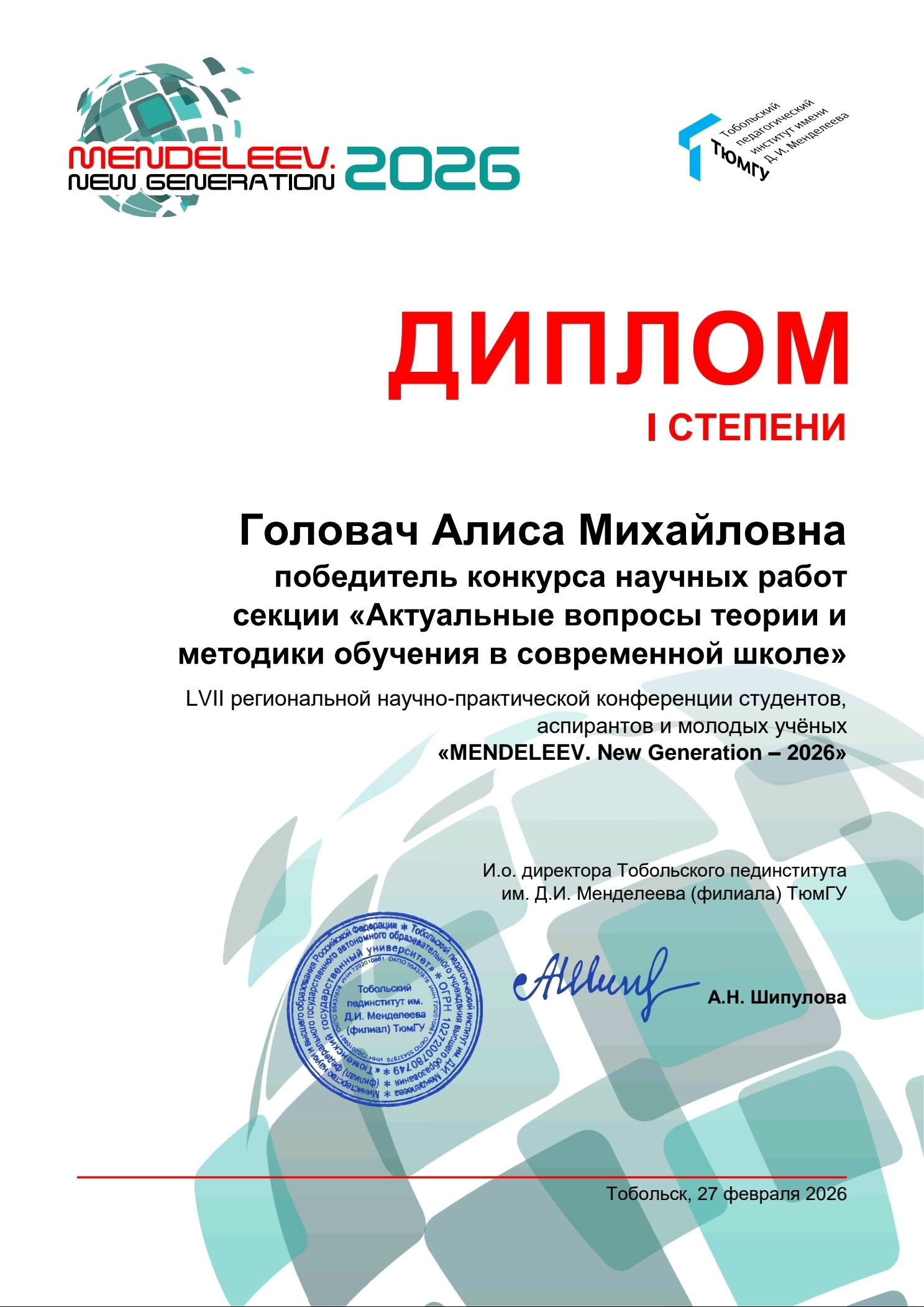 Головач Алиса Михайловна, студентка 3-го курса, научный руководитель – старший преподаватель Саттарова Лиана Сибагатовна, удостоилась Диплома I степени в секции «Актуальные вопросы теории и методики обучения в современной школе».