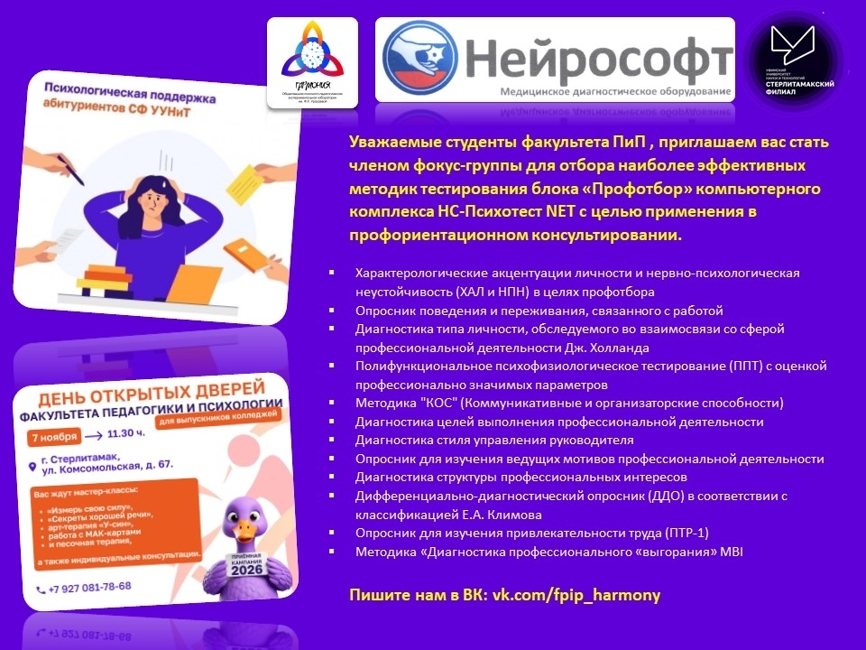 В связи с этим мы приглашаем студентов для формирования батареи тестов профдиагностики. Стать членом экспериментальной фокус-группы можно по согласованию в сообщении нашей группы «ВКонтакте» или сообщении в Мах: +7986 960 53 38 Эмилия