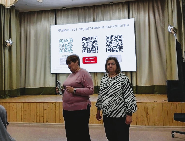 Елена Вениаминовна Головнева, доктор педагогических наук, профессор кафедры дошкольного и начального образования, и Людмила Николаевна Уварова, кандидат психологических наук, доцент кафедры психолого-педагогического образования, познакомили обучающихся с направлениями подготовки, которые реализуются на факультете педагогики и психологии, с формами, сроками обучения, основными правилами приема; с возможностями обучения как на дневном, так и на заочном отделениях, о сокращенном варианте его получения на базе СПО в Стерлитамакском филиале УУНиТ, особенностями целевого обучения, а также с наличием бюджетных мест. Также рассказали о тесном творческом сотрудничестве факультета и колледжа.