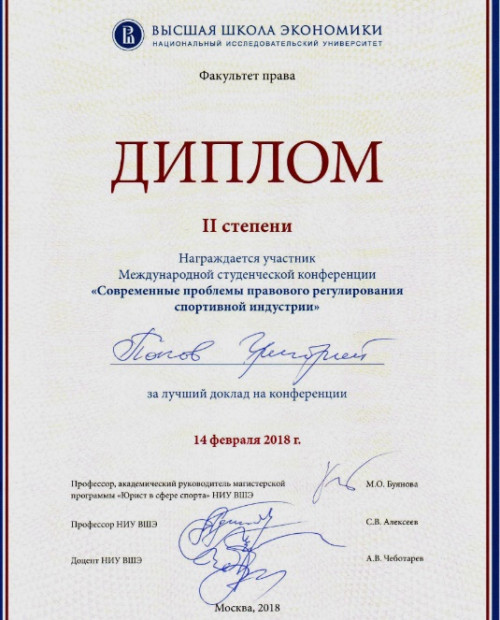14 февраля 2018 года на факультете права Национального исследовательского университета «Высшая школа экономики» (г. Москва) прошла Международная студенческая конференция на тему «Современные проблемы правового регулирования спортивной индустрии».