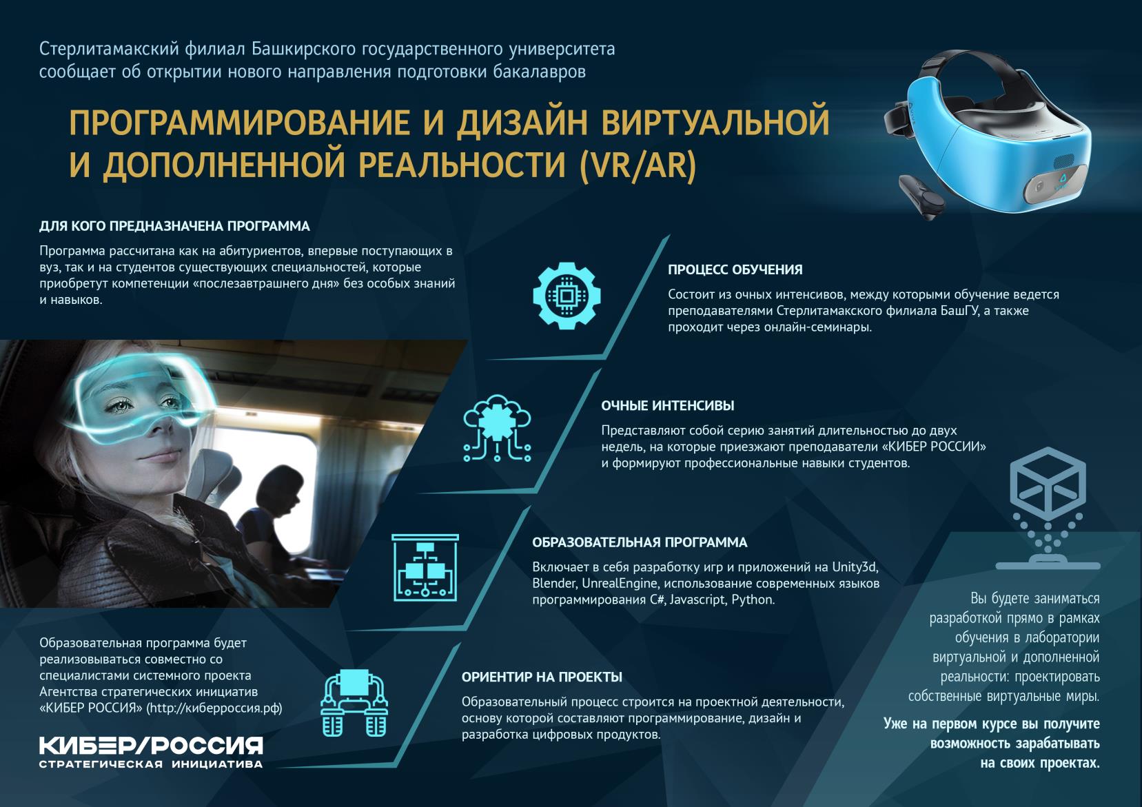 Важной задачей НОЦ «Цифровые образовательные технологии» является запуск в Стерлитамакском филиале УУНиТ новых направлений подготовки бакалавров и магистров, востребованных в условиях цифровой экономики. Первые бакалавриат и магистратура «Программирование и дизайн виртуальной и дополненной реальности» стартует с 1 сентября 2018 года. Процесс обучения будет организован совместно с командой московских специалистов системного проекта АСИ «Кибер Россия» (http://киберроссия.рф), которые будут учить студентов игровому дизайну, созданию пользовательских сценариев, разработке и продуктовому менеджменту VR- и AR-контента. При обучении будут использованы самые современные технологии и лаборатория виртуальной и дополненной реальности, программное и аппаратное обеспечение.